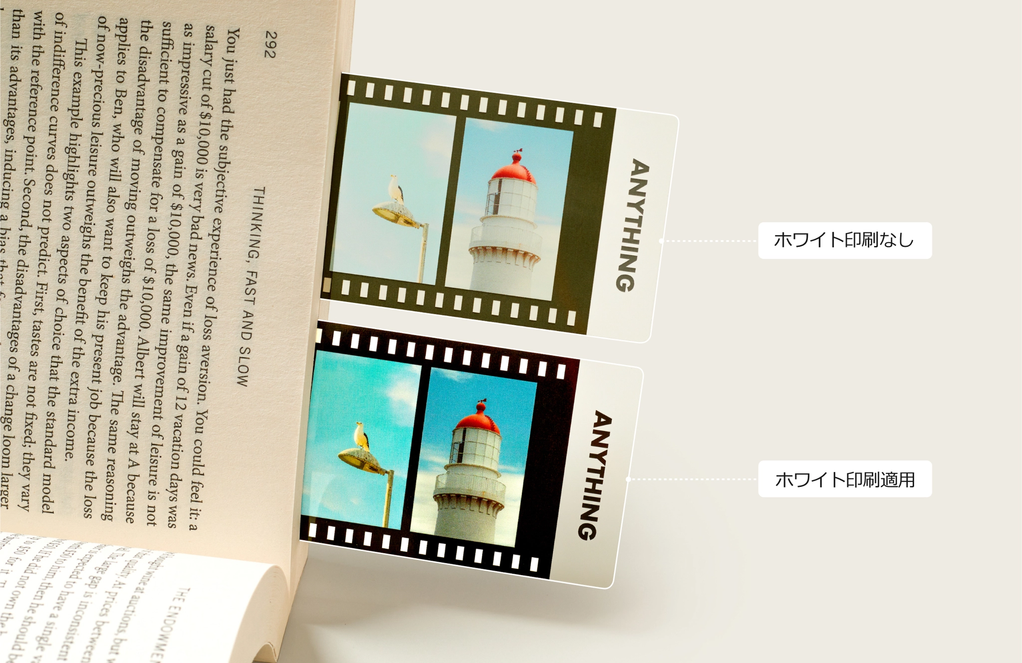 ホワイト印刷なしにすると、本物のフィルムのように透明感のあるデザインになります。