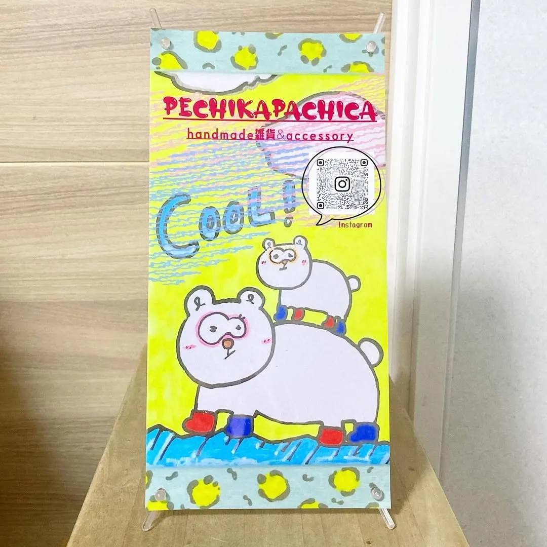 pechikapachicaのイラスト長靴しろくまの親子を宣伝用のポップスタンドとしてInstagramのQRコードも入れて作ってみました